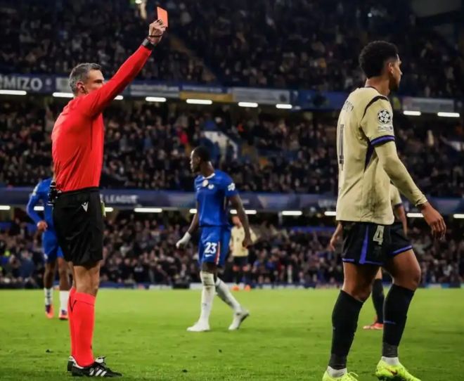第29分钟,切尔西前场连续进攻,加纳乔禁区左侧爆射被挡出,古斯托禁区右侧抢到皮球再组织进攻回传中路,詹姆斯禁区弧顶处迎球怒射,皮球稍稍高出横梁出了底线。第31分钟,阿劳霍怒喷裁判领到一张黄卡。上半时尾声阶段巴萨再遭重创,阿劳霍在争抢中凶狠铲倒库库雷利亚,主裁不手软,12分钟内给他颁发了第2张黄卡,阿劳霍2黄变1红被罚下场。