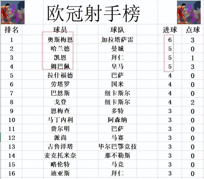 射手榜方面,奥斯梅恩缺阵,还是6球位列榜首,哈兰德,凯恩和姆巴佩5球并列第2。拉什福德,劳塔罗,巴恩斯和戈登4球并列第5。马丁内利,费尔明,麦克托米奈,略伦特等人3球刚好挤入前十。